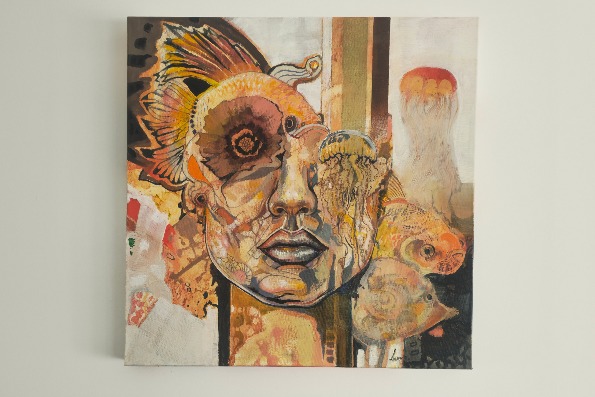 Between light and fragrance, her emotions swim in the depths of a sea of love, where the flower intertwines with the lantern, and the fish tell stories submerged in the silence of existence.