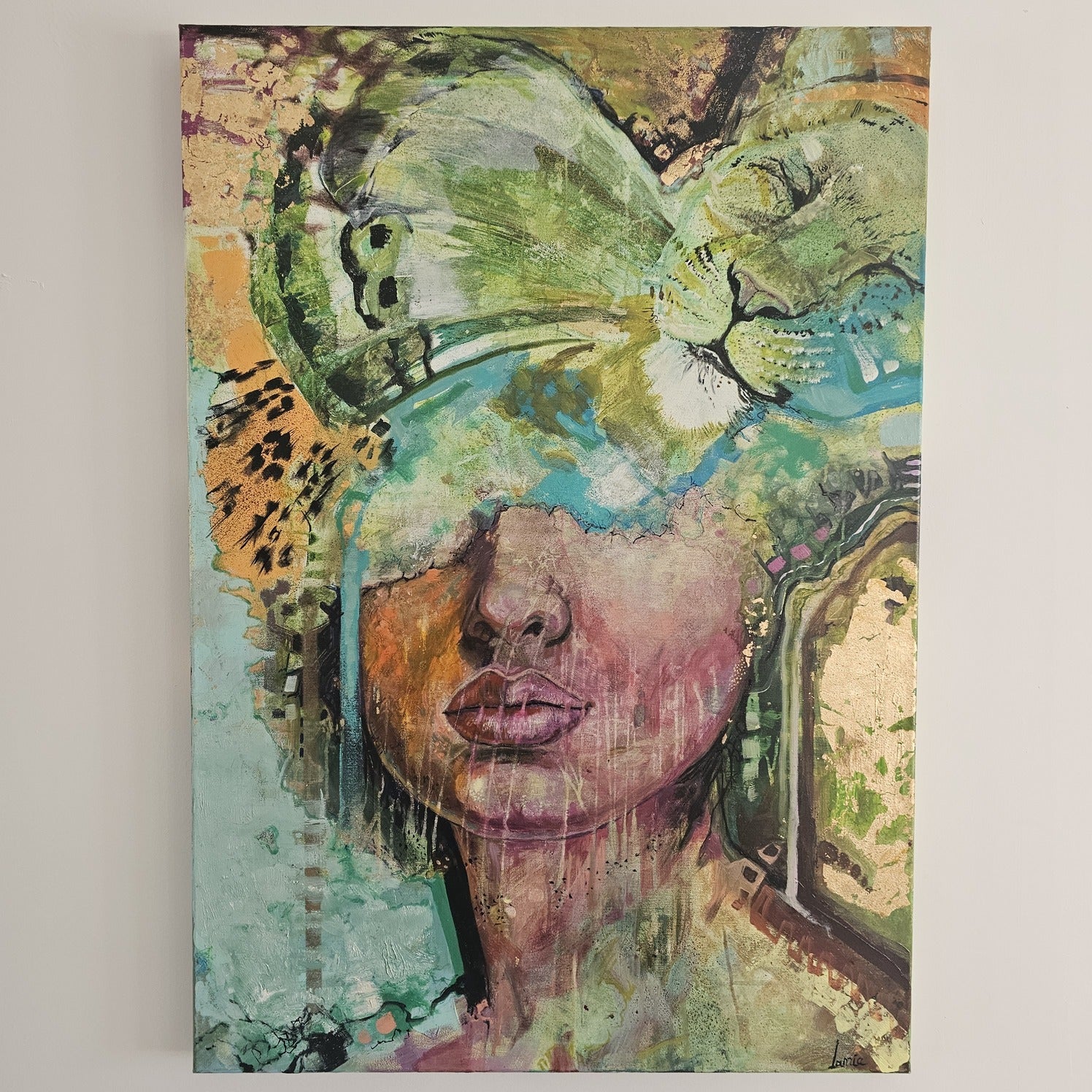 My ferocity sleeps in silence, flying with butterflies in a golden dream. A woman hides her features behind a visual silence, while the sleeping tiger upon her head reveals her mysterious duality: gentle and outwardly calm, yet her fierceness lies dormant, waiting to awaken. Hope is a butterfly that only arrives when the ferocity of dreams has quieted