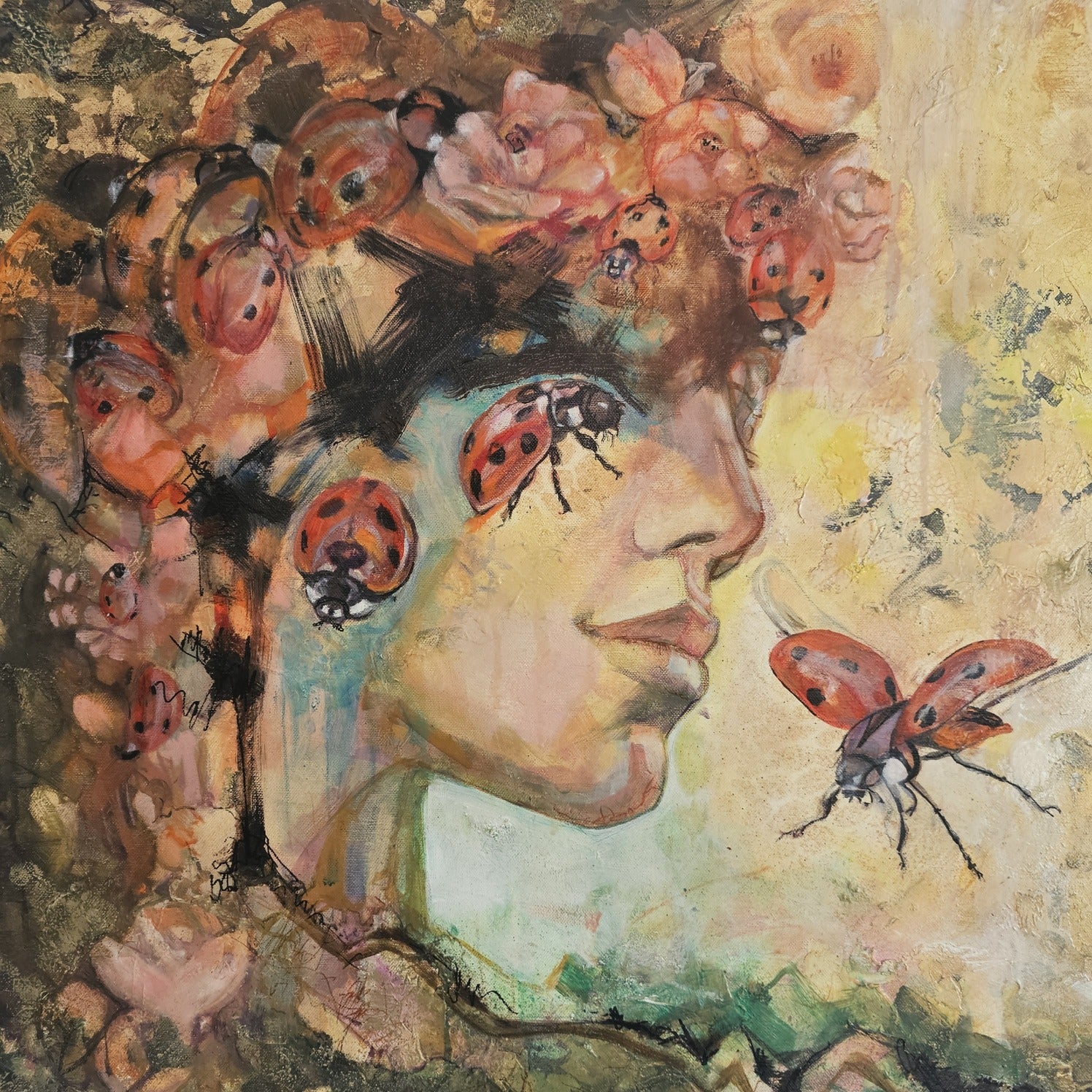 Wings of love touch the horizon, soaring in the dawn of the face as if telling the story of a new fortune, where ladybugs scatter around, carrying endless hope, and flowers gently open the doors of life with a smile.